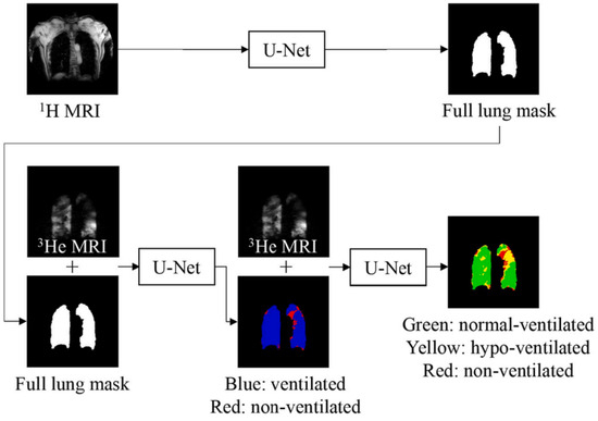 - Astley, J.R.; Biancardi, A.M.; Hughes, P.J.C.; Smith, L.J.; Marshall, H.; Eaden, J.; Bray, J.; Weatherley, N.D.; Collier, G.J.; Wild, J.M.; et al. 3D Deep Convolutional Neural Network-Based Ventilated Lung Segmentation Using Multi-Nuclear Hyperpolarized Gas MRI. In Thoracic Image Analysis; Petersen, J., San José Estépar, R., Schmidt-Richberg, A., Gerard, S., Lassen-Schmidt, B., Jacobs, C., Beichel, R., Mori, K., Eds.; Lecture Notes in Computer Science; Springer International Publishing: Cham, Germany, 2020; Volume 12502, pp. 24–35. ISBN 978-3-030-62468-2. [Google Scholar]