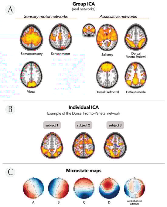 - Fox, M.D.; Snyder, A.Z.; Vincent, J.L.; Corbetta, M.; Van Essen, D.C.; Raichle, M.E. The human brain is intrinsically organized into dynamic, anticorrelated functional networks. Proc. Natl. Acad. Sci. USA 2005, 102, 9673–9678. [Google Scholar] [CrossRef] [PubMed]