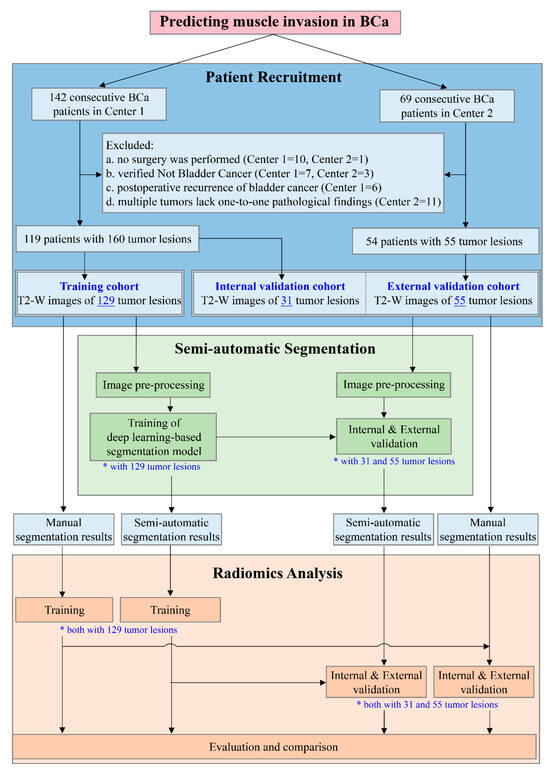 Study design flowchart. A total of 119 patients with 160 bladder tumor lesions in Center 1 and 54 patients with 55 tumor lesions in Center 2 were included. The training cohort, consisting of 129 tumor lesions from Center 1, was used to develop the semi-automatic segmentation model and the segmentation results were subsequently employed for the development of the radiomics model. The remaining 31 tumor lesions from Center 1 and 55 tumor lesions from Center 2 were regarded as the internal and external validation cohorts, respectively, for the independent evaluation of each model to compare the performance of the radiomics model based on semi-automatic segmentation with that of the radiomics model based on manual segmentation. Both * and underline highlight the number of tumor lesions in the corresponding procedure. (BCa, bladder cancer; T2-W, T2-weighted).