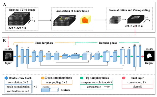 The voxel values of every VOI were reformatted as [0, 1] using min-max normalization to lower the data variance. To unify the input shape for the segmentation network, a zero-padding strategy was utilized to resample the VOI to 256 × 256 voxels in the xy-plane. Following normalization and resampling, each transverse slice within each VOI was fed into the segmentation network. The segmentation network used the contour of the lesion manually delineated layer-by-layer on the T2-W image by an experienced radiologist (J.L.) as the reference standard. The workflow of image preprocessing is shown in Figure 2A.