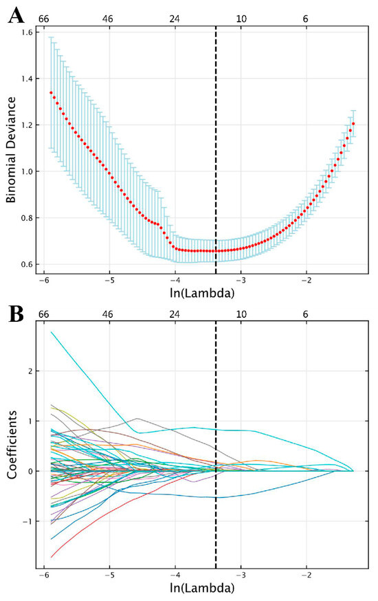 To eliminate redundant features, we first applied Z-score standardization to unify the units of each feature, followed by the least absolute shrinkage and selection operator (LASSO) algorithm to select features with non-zero coefficients. The feature selection procedure was executed on the training cohort and used for the validation cohorts, implemented in R (version 4.0.4; http://www.r-project.org/, accessed on 1 December 2022).