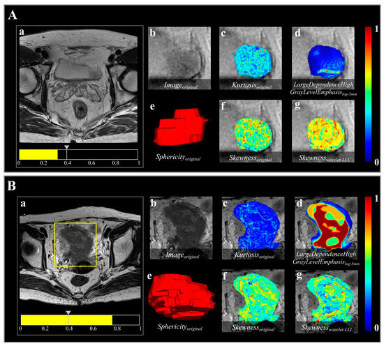 Two representative bladder lesions analyzed using the radiomics model based on semi-automatic segmentation results. Images show the result in (A) a 63-year-old male with NMIBC and (B) a 76-year-old female with MIBC. The predicted probabilities of the radiomics model for the cases in (A,B) were 0.321 and 0.769, respectively. (a) A threshold of 0.396 (the gray arrow on the scale) was used to visualize the lesion in each case and for the model to classify them as either NMIBC or MIBC. (b) shows the region highlighted in the yellow box in (a), indicating the tumor lesion in the original T2-W image. (c–g) Radiomics features overlaid on the T2-W image, as follows: (c) Kurtosisoriginal, first-order feature indicating sharpness of gray-level histogram distribution; (d) LargeDependenceHighGrayLevelEmphasislog-5mm, texture feature representing gray-level dependence matrix (gldm) achieved through transformation of “Laplacian of Gaussian (LoG)” filter with sigma value of 5.0, indicating intratumoral heterogeneity; (e) Sphericityoriginal, shape feature, volume-rendering reconstruction of bladder lesion indicating three-dimensional shape; and (f,g), Skewnessoriginal and Skewnesswavelet-LLL, both first-order features, indicating asymmetry of gray-level histogram distribution, obtained from image transformed by “Wavelet” filter with three high-pass [H] filters acting on x, y, and z axes (LLL).