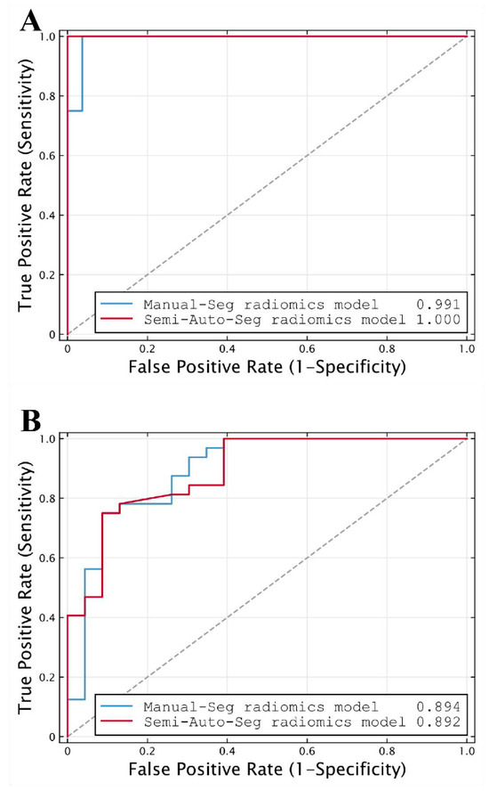 The feature selection results of the radiomics model based on manual segmentation are shown in Supplementary Materials S2, wherein 24 radiomics features are ultimately selected. The model achieved a similar performance to that of the model based on semi-automatic segmentation results, with an AUC of 0.991 (95% CI, 0.871–1.000; p < 0.001) in the internal validation cohort and 0.894 (95% CI, 0.781–0.961; p < 0.001) in the external validation cohort (Table 4; Figure 6).