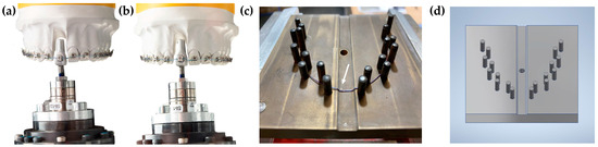 Visualisation of the high-strength titanium alloy Kavo Typodont model adapted to SAM® Axiosplit® mounting plates (SAM Präzisionstechnik GmbH, Gauting, Germany) and the test tooth in (a) an extruded position and (b) intruded position after orthodontic tooth intrusion using Sentalloy 0.012″ NiTi archwire (Dentsply Sirona, York, PA, USA) with intrusion steps. Graphical presentation of (c) the intrusion step template and (d) the CAD design for the fabrication of the tool. The counterpart of the shape setting tool is not shown here. The tool temperature was controlled via an internal Ni-CrNi thermocouple located in close proximity to the sample (position is marked by the white arrow in (c)).