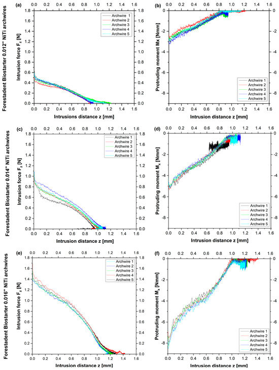 Taken together, Biostarter 0.016″ (Forestadent) archwires reached the highest intrusion distances, while the initial intrusive forces were second lowest compared to 0.016″ archwires by other manufacturers (Figure 2). Biostarter 0.012″ archwires presented low mean initial forces (Fz = 0.561 N) and moments (Mx = −2.649 Nmm) with similar curve progressions for the five investigated wires (Figure 2a,b). An accumulation of the measured values was found at the end of the test sequence since only marginal tooth movement was seen (Figure 2a,b). The initial intrusive forces of Biostarter 0.014″ archwires were almost twice as high as 0.012″ archwires (Fz = 1.074 N), and the force curves deviated further from each other (Figure 2c). Yet, similar curve shapes were seen for the protruding moments of Biostarter 0.014″ archwires with a mean initial moment of Mx = −4.753 Nmm and a cluster toward the end of the measurement, indicating the short-term inversion of the direction of motion (Figure 2d). The initial intrusive forces of Biostarter 0.016″ archwires (Fz = 1.578 N) were 0.5 N higher than those of 0.014″ archwires and 1 N larger compared to 0.012″ archwires, respectively (Figure 2e). The force curve progressions were similar, with moderate diversification and greater flattening with a cumulation of values toward the end (Figure 2e). Mean protruding moments of Mx = −7.261 Nmm were found for Biostarter 0.016″ archwires, and the curve shapes were steeper with distinct curvatures and a clustering of data at the end (Figure 2f).