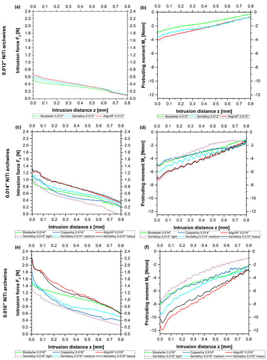Initial intrusive forces Fz [N] (a,c,e) and protruding moments Mx [Nmm] (b,d,f) regarding the reference distance of 0.8 mm are given for all measured 0.012″ NiTi archwires and (a,b) 0.014″ NiTi archwires (c,d) and 0.016″ NiTi archwires (e,f) without intrusion steps. The averaged curves with superimposed best fit straight lines are given.