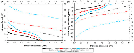 Initial intrusive forces Fz [N] in relation to the intrusion distance z [mm] (a) and the protruding moments Mx [Nmm] in relation to the intrusion distance z [mm] (b) are given for Dentsply Sirona Sentalloy 0.012″, 0.014″ and 0.016″ medium NiTi archwires with and without intrusion steps.