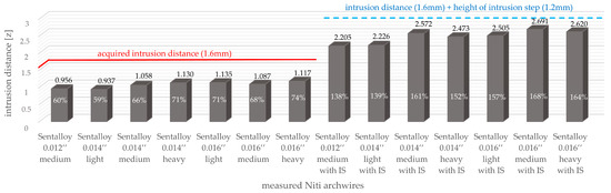 During the simulated intrusion, none of the investigated archwires without steps, regardless of the manufacturer and respective diameter, reached the full intrusion distance of 1.6 mm (archwires without intrusion steps). NiTi archwires with a smaller wire dimension generally reached slightly lower intrusion distances compared to larger wire dimensions, e.g., Sentalloy 0.014 light achieved 59% of the aspired intrusion distance and Sentalloy 0.016″ light reached 71%, respectively (Figure 5). Three exceptions were noted when comparing the archwires of different material compositions, e.g., the Sentalloy 0.014″ light produced lower forces than the Sentalloy 0.012″ medium, and the Sentalloy 0.016″ medium produced lower forces than the 0.014″ Sentalloy heavy (Figure 5). All measured archwires with intrusion steps of 1.2 mm exceeded the intrusion distance of 1.6 mm, e.g., the Sentalloy 0.012″medium with IS achieved 138% and the Sentalloy 0.016″ medium with IS reached 168%, respectively (Figure 5). Adding the intrusion step height to the intrusion distance, a maximum intrusion distance of 2.8 mm can be expected for archwires with intrusion steps; yet, while all analysed archwires with steps exceeded 1.2 mm, none of them reached a 2.8 mm intrusion distance (Figure 5).