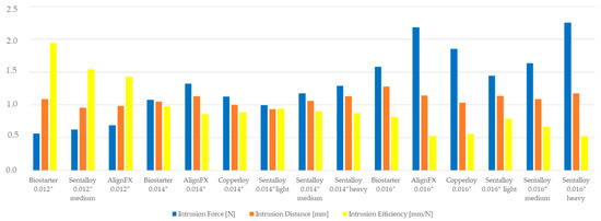 From Figure 6, it is clear that across more or less all suppliers, smaller diameters still deliver significant intrusion distances even though the amount of intrusion forces are only in the range of 25–30% compared to the larger-sized wires. The yellow columns in Figure 6 indicate this conclusion, and the tendency of the “intrusion efficiency” is very clear. This finding may be attributed to the increased play in the bracket slot, thus leading to a reduced frictional force between the archwire and slot [50,51]. For clinical use, this means that smaller wire sizes with delivered intrusive forces far below 1 N may still lead to sufficient intrusion results by reducing the risk of root resorption.