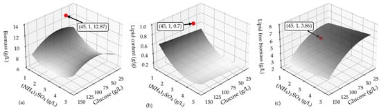 | Glucose, 45 g/L (NH4)2SO4, 1 g/L | Biomass (g/L) | 10.68 | 12.87 ± 0.22 |