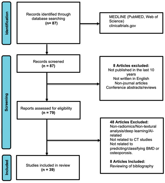 The preliminary search of the main electronic medical databases (Figure 1) identified a total of 87 relevant articles, which were screened using the aforementioned criteria. This screening led to the initial exclusion of eight publications, and the remaining 79 articles underwent further full-text analysis to determine inclusion. Upon detailed analysis of the text, a further 48 publications were removed, as they either did not focus on the classification of osteoporosis or did not utilize AI methods. An additional eight articles were included after manually reviewing the bibliography of the selected articles. Overall, this culminated in a total of 39 articles (Figure 1) for in-depth analysis. The key findings were compiled and summarized in this review (Table 1). Most studies lacked detailed data to create 2 × 2 contingency tables, and hence a formal meta-analysis could not be performed.
