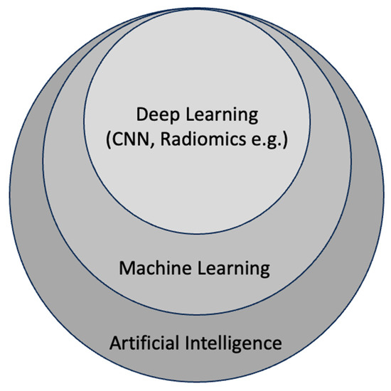 Artificial intelligence, often abbreviated as AI, involves harnessing the computational abilities of machines to carry out tasks resembling human activities [108]. This encompasses utilizing specific inputs to create outcomes that hold potential additional value [109]. Recent advancements in medical imaging alongside the accumulation of significant quantities of digital images and reports [110,111] have ignited increased worldwide interest in implementing AI in the medical imaging domain [112]. Initially conceived to aid radiologists in identifying and evaluating potential irregularities, both AI and computer-aided diagnostic (CAD) systems focus on amplifying efficiency, enhancing detection rates, and minimizing errors [113,114]. As a result, dedicated initiatives are striving to enhance AI’s diagnostic capabilities and optimize its efficiency for seamless integration into clinical practice. The emergence of convolutional neural networks, inspired by the mechanisms of the human brain, has introduced a range of computational learning models primarily centered around machine learning (ML) and deep learning (DL) algorithms [115]. These models have played a pivotal role in propelling the widespread adoption of AI in radiology.