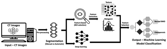 Deep learning (DL), a subset of ML (Figure 2), mimics the structure of neural networks in the brain. It employs artificial neural networks with multiple hidden layers to solve complex problems. These hidden layers enable the system to continuously learn and improve its performance by incorporating new knowledge. Unlike traditional ML, which requires manual extraction of features from input images, DL methods learn features directly from input images using multilayer neural networks like convolutional neural networks (CNNs). This approach allows DL systems to not only map image features to outputs but also learn the features themselves. Examples of DL outputs include image categories (classification), object locations (detection), and pixel labels (segmentation). Deep learning has given rise to the field of radiomics, which entails extracting a multitude of quantitative features from medical images, including CT scans, to unveil hidden patterns through computational analysis. In the context of bone health, radiomics employing deep learning techniques has the potential to identify imaging features related to important pathological and histological characteristics of bone trabeculae. These features can surpass human diagnostic capabilities and potentially outperform conventional imaging methods. The primary machine learning methods in use are radiomics-based feature analysis (Figure 3), which involves manually designed feature extraction integrated into deep learning training datasets [116], and convolutional neural networks (CNN), which automatically extract valuable image features to classify data directly from input images [117]. CNNs enable the identification of diagnostic patterns and features that exceed human capacity and have applications in osteoporosis diagnosis and classification [118,119].
