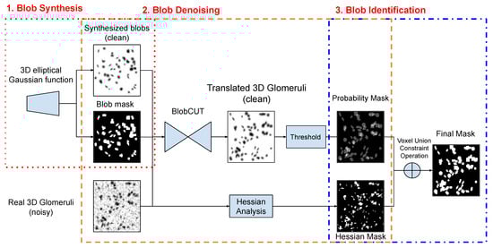 Imaging biomarkers are measurable features or characteristics that are detected using medical imaging technologies, such as magnetic resonance imaging (MRI), computed tomography (CT), positron emission tomography (PET), or ultrasound. These biomarkers provide objective and quantitative measures of disease or injury and are often used in medical research and clinical practice to diagnose, monitor, and evaluate the progression or treatment response of the disease. In particular, some important imaging biomarkers are derived from small, densely distributed structures (e.g., cell nuclei, kidney glomeruli) known as “blobs” in vivo. The characterization of blobs based on features such as shape, size, and quantity has led to their use as imaging biomarkers to aid in diagnosis, prognosis, and treatment planning [1,2,3,4]. Thus, the detection and segmentation of blobs in medical images are critical for accurately assessing and interpreting disease states.