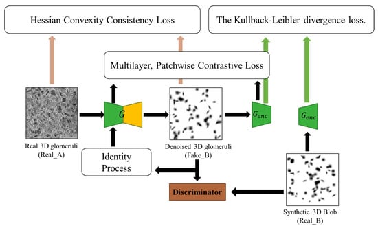 Finally, It is not enough for the generative model to have the convexity consistency constraint to denoise the real glomeruli, because the original CUT was not designed to capture pixel/voxel differences. Thus, we enforce a Probability distribution constraint which involves a Kullback-Leibler divergence (KLD) loss to minimize the distance between two intensity distributions. We compare the distributions of the output denoised 3D gloms with our synthetic 3D blobs to make the BlobCUT have good generation quality. After obtaining the translated image (), the number of glom can be determined by using connected component analysis, assuming there is no noise in the image. Subsequently, a random image with an equivalent number of gloms is generated using the 3D elliptical Gaussian function. These two images are then fed back into the encoder of the generator G to obtain the intensity distribution representations of the images. The Kullback-Leibler Divergence (KLD) loss is calculated for the two intensity distributions. By minimizing the KLD loss, the translated image can be ensured to have a similar distribution to the synthetic image. This approach effectively addresses the issue of small object blurring that is present in the original CUT model-generated image by utilizing the intensity distribution information.