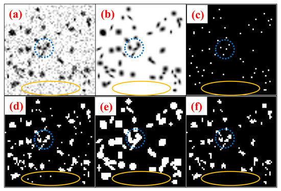 where the joint operator ⊙ is the Hadamard product. Figure 3 shows the step-by-step methodology of blob identification through BlobCUT and joint constraint operation. Figure 3a–c shows the original noisy blobs image, the clean blob image of blobs without noise, and the centroids of the blobs’ ground truth in respective order. While Figure 3d–e shows the Hessian convexity mask and the blob mask that were generated using BlobCUT. Finally, Figure 3f shows the final blob identification mask generated by the joint operation. The blue circle in parts (a), (b), and (c) shows a total of four blobs, three of which are overlapping while the fourth is separated. In the Hessian convexity mask shown in part (d), they are correctly identified as four distinct blobs. However, In the blob mask shown in part (e), all four blobs are incorrectly segmented as one blob highlighting the under-segmentation issue discussed previously. The yellow-colored ellipse shows a segment of the noise that needs to be cleaned from the image. It is obvious from part (e) that the blob mask is able to distinguish this segment as pure noise and successfully remove it while the Hessian mask in part (d) incorrectly identifies the noise as blobs, causing some of the noisy regions to be detected as blobs. Which highlights the over-segmentation issue in the Hessian mask. Therefore, by taking the intersection of the Hessian convexity mask and the blob mask, their respective issues of under-segmentation and over-segmentation are alleviated. The effectiveness of this operation has been validated by multiple significant experiments in [32]. The final blob mask derived by the joint constraint operation is shown in Figure 3f. Clearly, it is able to selectively segment the blobs while avoiding over-segmentation of noisy regions.