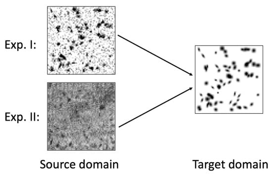 In the context of the target domain, we randomly generated a dataset consisting of 1000 3D blob images, each with dimensions of voxels, for use in both experimental settings. For each 3D blob image, blobs were spread in random locations. The number of blobs for each image ranged from 500 to 800. The parameters of the 3D elliptical Gaussian function for each synthetic blob are as follows: and are set to x are all set to . We record the blob mask of each image.