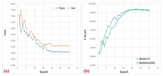 Illustration of the learning curve. (a) Loss curve comparison between training and validating of BlobCUT. (b) Testing F-score comparison between BlobCUT and BlobDetGAN.