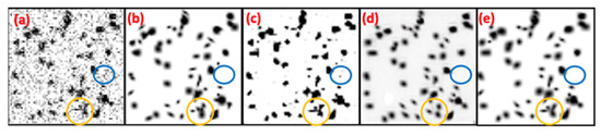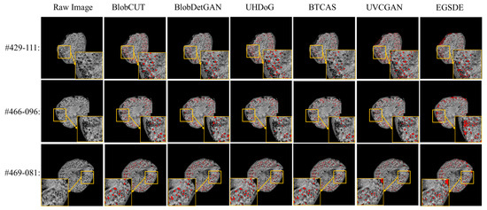 Research [13] indicates that Hessian analysis lacks robustness against noise, making noise easily misidentified as false positives. To address this issue, UH-DoG and BTCAS utilize probability maps from a pretrained U-Net to denoise blob images. However, this may result in suboptimal denoising performance, as objects in pre trained public datasets still have different distributions from noise. To illustrate this point, Figure 8 compares the denoised results of U-Net, 3D CUT, and BlobCUT. From Figure 8b, it is evident that the blue circles in Figure 8a represent noise, but they appear as blobs in Figure 8c and are not visible in Figure 8d,e. This suggests that 3D CUT and BlobCUT outperform U-Net in denoising performance. However, noise may indirectly impact the translation of blobs, altering their shapes. Comparing the yellow circles in Figure 8b,d, it is clear that there are differences in the shapes of the blobs. The blobs within the yellow circle in Figure 8e exhibit a much similar shape to those in Figure 8b. This demonstrates that BlobCUT is capable of preserving the geometric properties of blobs during translation. However, without constraint on translation, CUT may experience geometric distortion. In conclusion, BlobCUT excels in denoising performance and effectively shields blobs from the influence of noise during the denoising process.