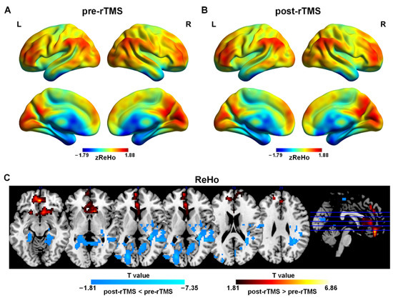 3.2. rTMS-Induced ReHo Changes between Pre-rTMS and Post-rTMS