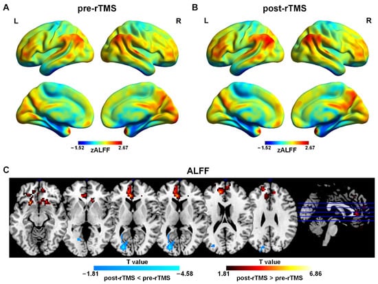 Spatial distribution patterns of ALFF in adolescents with MDD pre-rTMS (A) and post-rTMS (B) treatment. Warm colors represent that ALFF was higher than the whole brain level, while cool colors show that ReHo was lower than the whole brain level (p < 0.001, FDR correction). (C) ALFF differences in adolescents with MDD pre-rTMS and post-rTMS. Warm colors represent that the values were higher in post-rTMS than those in pre-rTMS, while cool colors show that the values were lower in post-rTMS than those in pre-rTMS (p < 0.05, AlphaSim correction).