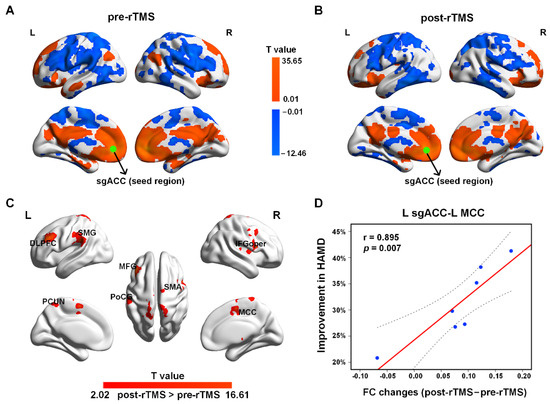 Furthermore, the FC between the left sgACC and the left DLPFC, the right IFGoper, the left MCC, and the left PCUN was enhanced after rTMS treatment. The sgACC is involved in modulating and processing emotional stimulus and behavior output and is usually applied as a probe to examine emotional networks in MDD patients [50,65]. sgACC has been widely utilized as a stimulating target in treating MDD [66,67,68]. Studies have shown decreased FCs between the sgACC and the insula, and the PFC regions (the inferior and superior frontal gyrus) in adolescents with MDD as well as in children with preschool-onset MDD [69,70]. What is more, a prior study also documented reduced FC between the sgACC and the PCUN in adolescents with MDD [71]. The MCC plays a key role in emotional regulation, emotional feedback integration, decision-making, social cognition, and negative affect [72,73,74], which is linked with the physiopathology of depression. In addition, we found that the stronger left sgACC–left MCC FC was related with more improvement in depressive symptoms in early improvers. After treatment, the FCs in the sgACC were increased, suggesting that the enhancement of FCs in the sgACC may have a protective effect on depression and a positive effect on the treatment of depression. A previous study confirmed that the FC between the sgACC and the left DLPFC could predict the rTMS efficacy [25]. Our findings may also support that the sgACC FC patterns with deeper brain regions might predict the efficacy of rTMS in treating MDD, and strengthen the role of the sgACC in the pathophysiology of MDD and as a therapeutic target.