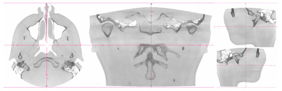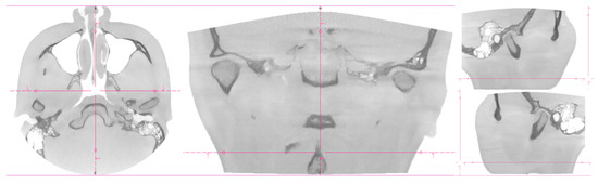 Two women probands (n = 2) were included. The same signs were experienced by the patients: pain in the temporomandibular joint area, stiffness of the masticatory muscles, and limited range of motion in the temporomandibular joint [17]. Objective examination: symmetrical faces without skin disorders, deformities, swellings, and skin efflorescence. Via palpation, the sensitivity of the masticatory muscles was present in the area of mm. temporalis et masseter bilaterally. Opening–closing cycle with sound phenomena, without significant deviation of the lower jaw, without limit in function. Patients’ dentitions were treated. Dentitions did not show signs of significant abrasion [40]. Result from cone-beam computed tomography for the temporomandibular joint (CBCT TMJ: an asymmetric position of the articular heads was visible in coronal and axial sections (Figure 1 and Figure 2).
