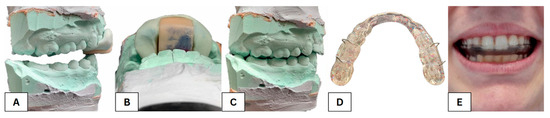 View of the plaster models of the upper and lower dentition fixed in a centric relationship with the sled deprogrammer (A), a detailed picture of the bite into the deprogrammer plate (B), and the modified relationship of the upper and lower dentition based on the centric relationship with the first contact in the area of the second molars (C), a traditionally made occlusal splint (D) and a traditionally made occlusal splint inside the mouth (E).