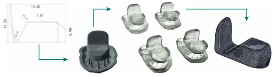 Three-dimensional printing pre-processing. (1) Scan plaster models of teeth with the 3Shape E2 dental 3D scanner (3Shape, Denmark). Photograph upper and lower dentition models, and scan the jaw relationship using a bite made with a jig. (2) CAD design of bite splint in SW 3Shape. (3) Export to mesh (STL creation). (4) Import data into SW PreForm (Formlabs, USA). (5) Prepare the model for printing. Precisely position 3D jig model for the CAD coordinate system. (6) Support structure design: full raft, density 0.50, touchpoint size 0.35 mm, layer thickness 0.100 mm. (7) Control of the main production parameters, i.e., the available material, choice of material, and wall thickness. (8) Export data to the 3D printer and the start of the production cycle (Figure 5).