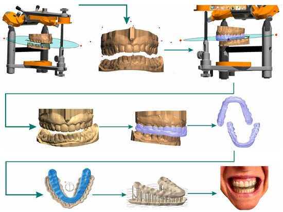 After establishing the diagnosis, the dentist used an anterior deprogrammer to create an interocclusal centric relation record [51]. Various clinical techniques can be employed to register the mandible in centric relation. The anterior stop is a helpful tool in identifying the centric relation position [52,53]. Following a confirmatory CT examination in this study, the dentist utilized a dimensionally adequate anterior deprogrammer to induce a physiologically correct relation between the upper and lower jaw. The participants were instructed to apply a moderate force on the deprogrammer device while rapidly protruding and retruding their mandible. Following this, they were required to maintain a centered relation position of their lower jaw for a period of time. Subsequently, occlusal registration material between the posterior teeth (only) was applied [51]. This article does not mention the traditional procedure to produce splints (Figure 3). It will focus more on a digital workflow [54] using artificial intelligence to facilitate the interpretation and reproduction of data.