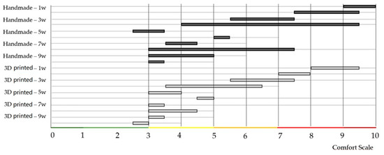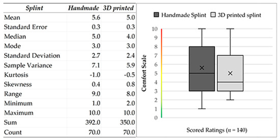 All calculations were performed using statistical data analysis. The Shapiro–Wilk test was used to determine the distribution of comfort data. Since n > 50 (Group1: handmade splint (n = 70); Group2: 3D-printed splint (n = 70)) we used the normal approximation to calculate the p-value. The p-value equaled The test showed a significant difference from normality, W(140) = 0.9, p < 0.001. Skewness shape: asymmetrical, right/positive (pval = 0.005). Kurtosis shape: platykurtic, short, thin tails (pval = 0.037). The null hypothesis of the normal data distribution was rejected; thus, we had to use a non-parametric test and the independence assumption, which means that the data were not connected in any way. The observations between groups were independent; the groups were made up of different people. The measured variable was the subjective feeling of the proband [56,57]. At the same time, secondary phenomena affecting the evaluation were also considered (toothache with subsequent treatment, draft, weather-sensitive or other complications, etc.). The obtained values had zero correlation and a non-parametric distribution. Therefore, the Mann–Whitney U test was used for analysis. In statistics, it is a nonparametric test of the null hypothesis in which, for randomly selected values X and Y from two populations (treatment), the probability of X being more significant than Y is equal to the probability of Y being more significant than X.