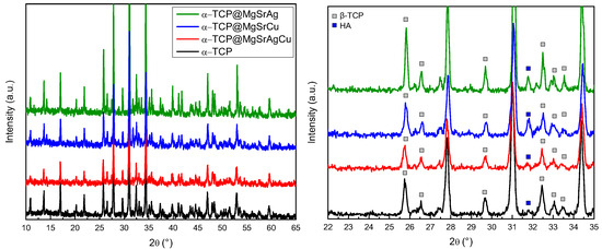XRD spectra of the sintered β-TCP, β-TCP@MgSrAgCu, β-TCP@MgSrCu, and β-TCP@MgSrAg disks with detail on the 2θ region from 22° to 35 2θ° indicating the peaks corresponding to β-TCP, α-TCP, and HA.
