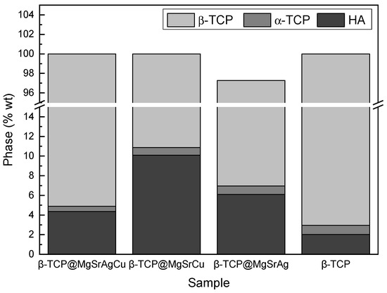 Phase matching was completed using the Rietveld refinement with the Profex® software (Figure 3). As can be observed in the results, the percentage of α-TCP is below 1% for all produced ceramics, indicating the samples do not have a significant amount of α-TCP phase. The percentages of HA varied between samples, from 2% in β-TCP to 10% in β-TCP@MgSrCu.