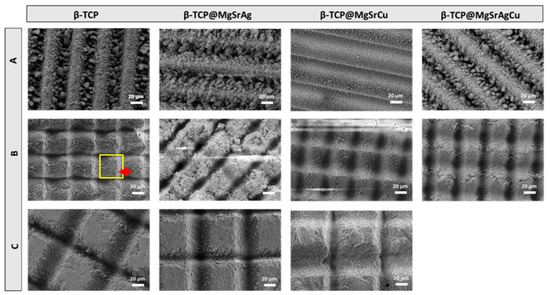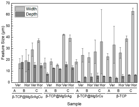 In the non-doped sample and the β-TCP@MgSrCu copper-doped samples, the grooves are shallower than in the β-TCP@MgSrAgCu and the β-TCP@MgSrAg. On the β-TCP@MgSrAg and the β-TCP@MgSrCu samples with grooves with a hatch distance of 100 μm, the groove width is double when compared to the sample prepared with a hatch distance of 50 μm, which indicates an overlap of the grooves when the hatch distance is 50 μm. The groove width and depth are the same in both scanning directions when the sample is ablated in a grid pattern. Overall, the groove depth is maintained when laser energy is increased within the same sample.