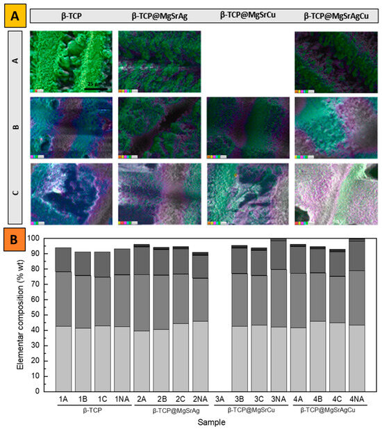 The EDS results (Table 2) show an excess of copper in all samples and a lack of Mg in the β-TCP@MgSrCu and β-TCP@MgSrAg samples. Overall, the incorporation of strontium occurred as desired, with the β-TCP@MgSrCu sample being the exception. It is also important to note that, due to the superimposition of the calcium and silver peaks, the latter cannot be quantified. Overall, there are no metals aside from those belonging to each composition, indicating that the samples were not contaminated in any step of the process.