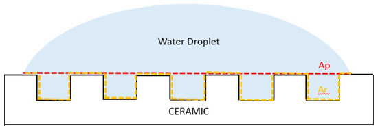 Schematic representation of a water droplet on a micro-structured ceramic surface with detail on the projected (Ap) and real (Ar) surfaces in contact with the liquid.
