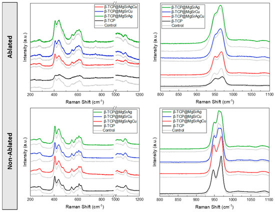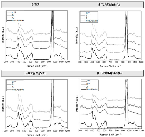 To evaluate the veracity of this theory, Raman analysis was conducted on ablated β-TCP disks of the four different compositions at the several ablation parameters used (Figure 10). The spectra of the ablated sample were compared to those of the non-ablated sample for each composition.