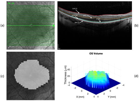 - Loo, J.M.; Jaffe, G.J.; Duncan, J.L.; Birch, D.G.; Farsiu, S. Validation of a Deep Learning-Based Algorithm for Segmentation of The Ellipsoid Zone on Optical Coherence Tomography Images of an Ush2a-Related Retinal Degeneration Clinical Trial. Retina 2022, 42, 1347–1355. [Google Scholar] [CrossRef] [PubMed]