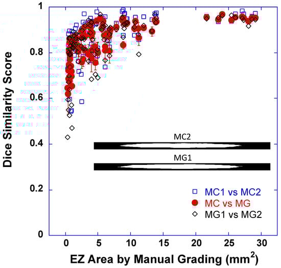 | Dice Score (EZ Band Segmentation) | All Cases | Cases with EZ Area ≤ 1 mm2 | Cases with EZ Area > 1 mm2 | ||||
