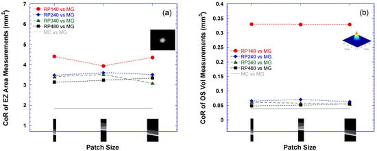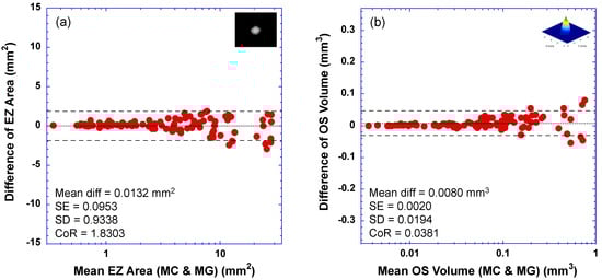| Agreement of EZ Area Measurements | CoR (mm2) | Mean Difference (SD) (mm2) | Mean Absolute Error (SD) (mm2) | Correlation Coeffiicent r (95% CI) | R2 | Linear Regression Slope (95% CI) | |