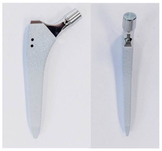 Photographs visualizing the used stem in anterior (left) and lateral (right) views: ANA.NOVA SL-complete, 127° CCD, double conus, calcium phosphate titanium plasma-coated press fit stem.