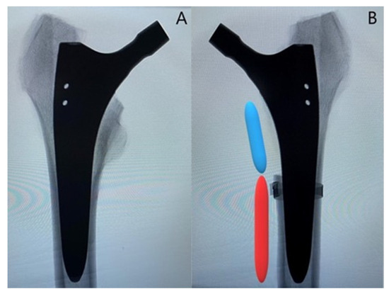 Representative anteroposterior X-rays of one instrumented specimen from each group: (A) specimen from the control group; (B) specimen from the treatment group with depiction of the created fracture model with an extent of 40% of the anchorage length of the stem (blue segment), while 60% of the anchorage length is preserved (red segment). Cerclage banding is visualized distally to the clamshell fracture.