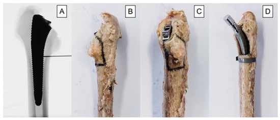 Depicted workflow for fracture model creation, based on individual stem size: (A) anteroposterior X-rays illustrating the definition of the craniocaudal extent of the fracture model. The desired 40% loss of medial anchorage was determined based on the serrations of the last rasp and measured using X-rays. The number of serrations, and thus the craniocaudal dimension of the fracture model, was calculated individually for each stem size. (B) dorsal-view photograph of an exemplified specimen with marked osteotomy lines; (C) dorsomedial-view photograph of an exemplified specimen with marked osteotomy lines; (D) anteromedial-view photograph of an exemplified specimen from the treatment group after instrumentation.