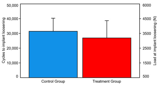Number of cycles and corresponding load at stem loosening were 31,417 ± 8870 and 3641.7 ± 887 N in the control group, and 26,944 ± 11,706 and 3194.4 ± 1170.6 N in the treatment group, respectively, with no significant differences between them (p = 0.106) (Figure 5).