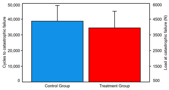 Number of cycles and corresponding load at catastrophic failure were 38,714 ± 10,018 and 4371.4 ± 1001.8 N in the control group, and 34,441 ± 10,618 and 3944.1 ± 1061.8 N in the treatment group, respectively, with no significant differences between them (p = 0.105) (Figure 6).