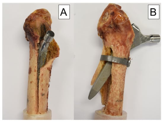 Ten pairs of fresh-frozen (−20 °C) human cadaveric femora from three female and seven male donors, aged 77 ± 10.2 years (mean value ± standard deviation; range 59–96 years), were used. No bony lesions, malignancy, or metabolic disease were detectable in the specimens by visual and radiographic examination. High-resolution peripheral quantitative computed tomography (XtremeCT, Scanco Medical AG, Brüttisellen, Switzerland) was used to determine the bone mineral density (BMD) before the start of the study to exclude potential extreme differences between the left and right femora of each pair. The specimens were assigned to two paired study groups—a control and a treatment group—with equal number of left and right anatomical sites. Prior to instrumentation, all specimens were thawed at room temperature, and their soft tissue was removed by an experienced surgeon. In addition, anteroposterior X-rays were taken (C-arm, Arcadis Varic, Siemens Healthineers, Erlangen, Germany), and the required sizes of the hip stems were measured individually for each femur using a planning program (mediCAD, Altdorf, Germany). A new calcium phosphate titanium plasma-coated diaphyseal anchoring press fit stem (ANA.NOVA SL-complete, Ti6Al4V alloy, 127° CCD, double conus design, polished taper; ImplanTec, Mödling, Austria) was used for each bone (Figure 1). The stems were inserted according to the manufacturer’s guidelines, using the press fit technique (Figure 2). The instrumentation of the stems was performed under X-rays control.