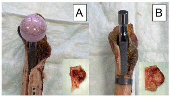 Exemplified modes of failure after biomechanical testing visualized with medial view photographs of specimens from each study group: (A) specimen from the control group after cyclic testing to failure, with its fragment as a result from the testing, shown in the embedded photograph; (B) specimen from the treatment group before cyclic testing, with its fragment as created with an oscillating saw, shown in the embedded photograph.