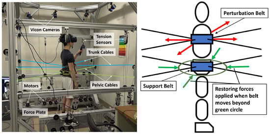 Training was conducted in RobUST, a cable-driven exoskeleton developed in the ROAR lab at Columbia University, Figure 1 [,]. It consists of two end-effector braces, each connected to four cables distributed around the brace circumference. Each cable is connected to a motor and thus each brace can be actuated in the horizontal plane. The system offers unique advantages in the training of postural standing by permitting weight bearing and only intervening when assistance is needed. It thereby encourages the improvement and not replacement of body function. In the device, a subject is able to train in close to real-life situations with some security provided by the device.