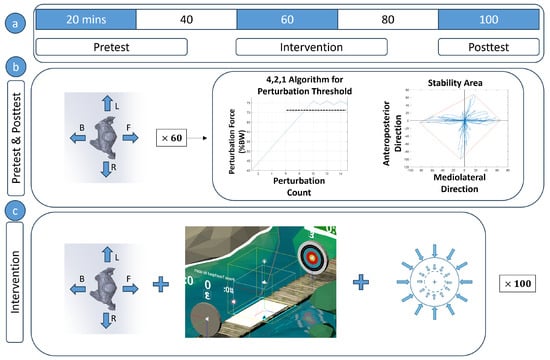 (a) Experiment procedure and timeline (b) The pretest and posttest were conducted in a similar fashion. Subjects were perturbed 60 times, (15 in the forward (F), backward (B), left (L), and right (R) directions) and the perturbation magnitude was progressed using the 4,2,1 algorithm. The perturbation force threshold and stability area were found during these tests. (c) In the intervention, subjects were perturbed while playing a virtual reality catch-and-throw game. A group of subjects had given force assistance and some did not. Force assistance was activated once the subject moved outside a boundary and continued till the subject was a negligible distance from the subject’s starting position.