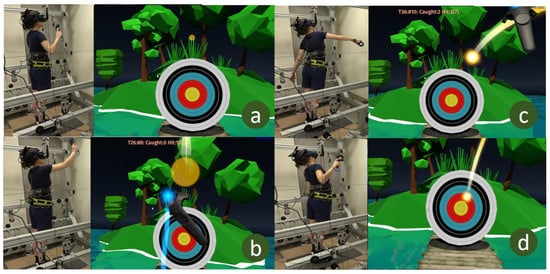 Figure 3. Subject and view from VR game. (a) Subject prepares to receive the ball, (b) subject catches the ball, (c) subject throws the ball, (d) subject tries to recover balance after throwing the ball at the target. - Postest: The posttest was identical to the pretest in which the force threshold and stability area were measured. The subjects took a 5-min rest before the posttest.
